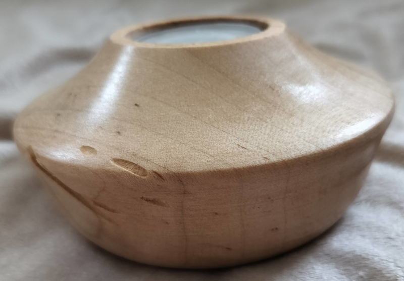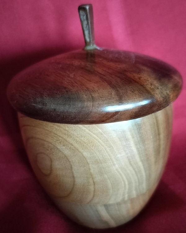 Turned segmented bowl made with oak and other hard woods, finished with a food-safe rub on polyurethane. Approximately 6 inches in diameter by 4.5 inches high. Donated by Whispering Windmill Workshop.